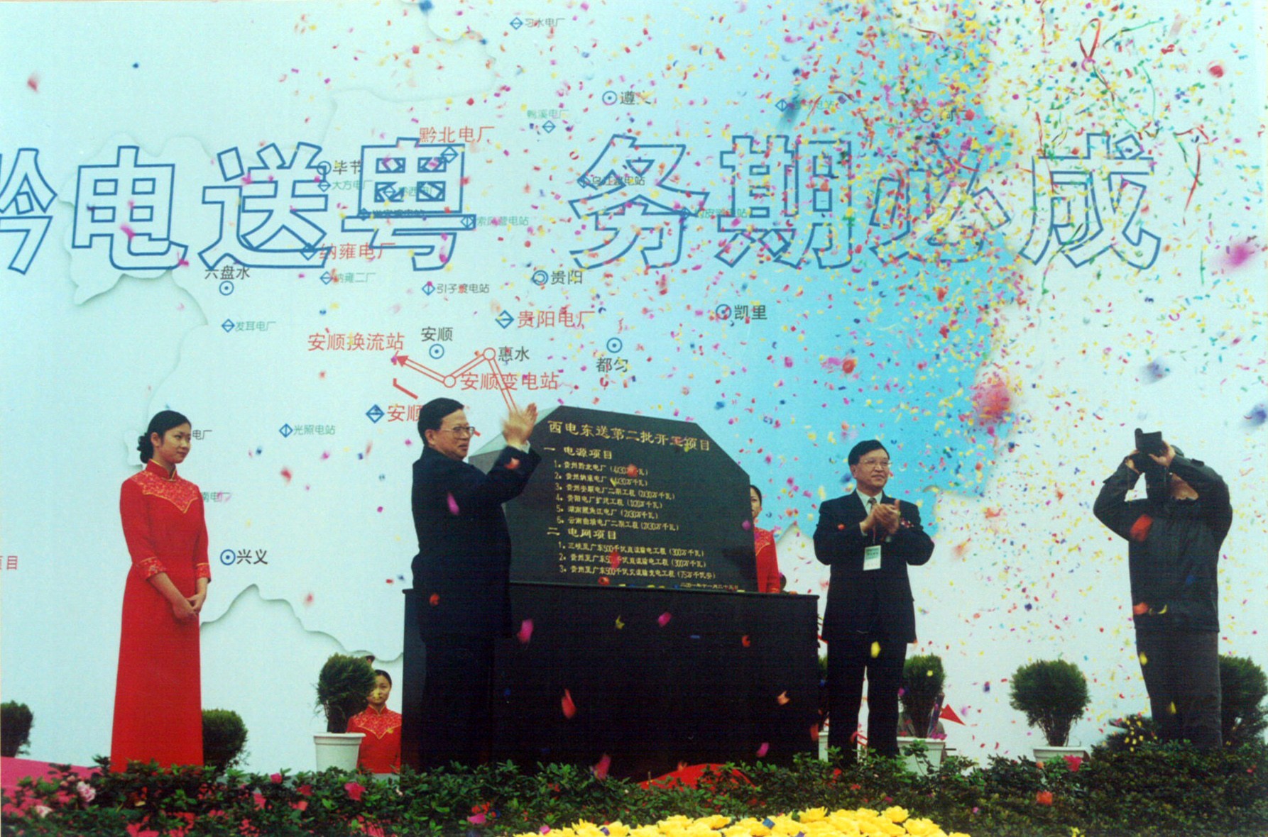 不久我們又組織了更大規(guī)模的第二次西電東送工程開工項(xiàng)目,一共有六個(gè)電源項(xiàng)目和三項(xiàng)輸工程項(xiàng)目,共計(jì)九個(gè)項(xiàng)目同時(shí)開工。電源項(xiàng)目有貴州的黔北電廠、納雍電廠二期、安順電廠二期、貴陽電廠擴(kuò)建,湖南的鯉魚江電廠和云南曲靖電廠二期工程也同時(shí)開工。