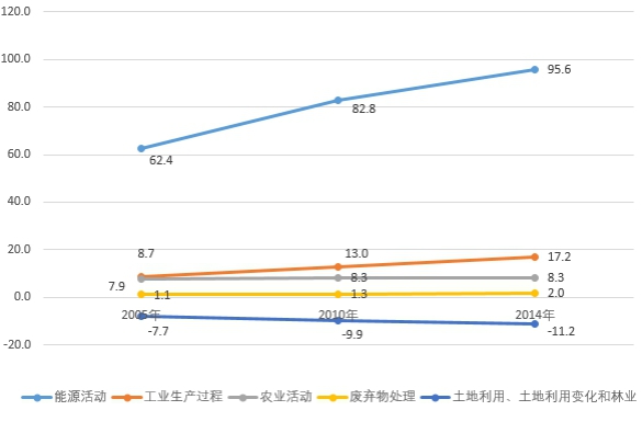 圖2 2005-2014年中國各領域溫室氣體排放和吸收(億噸CO2eq)
