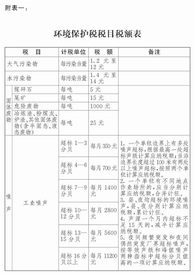 第六條 環境保護稅的稅目、稅額,依照本法所附《環境保護稅稅目稅額表》執行。