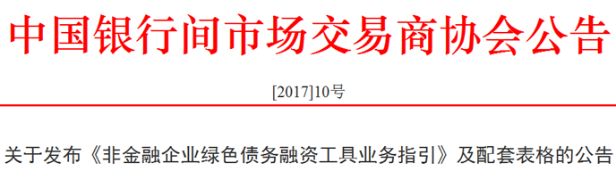為貫徹落實十八屆五中全會提出的“創新、協調、綠色、開放、共享”的發展理念和《生態文明體制改革總體方案》中構建綠色金融體系的戰略,加快推動經濟結構轉型升級和經濟發展方式轉變,實現綠色、循環、低碳發展,依據《銀行間債券市場非金融企業債務融資工具管理辦法》(中國人民銀行令〔2008〕第1號)及中國銀行間市場交易商協會(以下簡稱“協會”)相關自律規則,協會組織市場成員完成了《非金融企業綠色債務融資工具業務指引》及配套表格的起草工作,經協會第四屆債券市場專業委員會第一次會議和第五屆常務理事會第一次會議審議通過,并于2017年3月17日經中國人民銀行備案同意,現予發布施行。