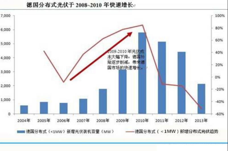 德國:鼓勵自發(fā)自用。在德國2013年的政策中,500KW以下的光伏發(fā)電系統(tǒng)可以采用“自發(fā)自用,余電上網”的政策;大于500kW的系統(tǒng)執(zhí)行“上網電價”政策。2MW以上的項目不予補貼。德國分布式發(fā)電在08年-10年出現爆發(fā)式增長,13年德國分布式的裝機量占光伏發(fā)電中的75%。